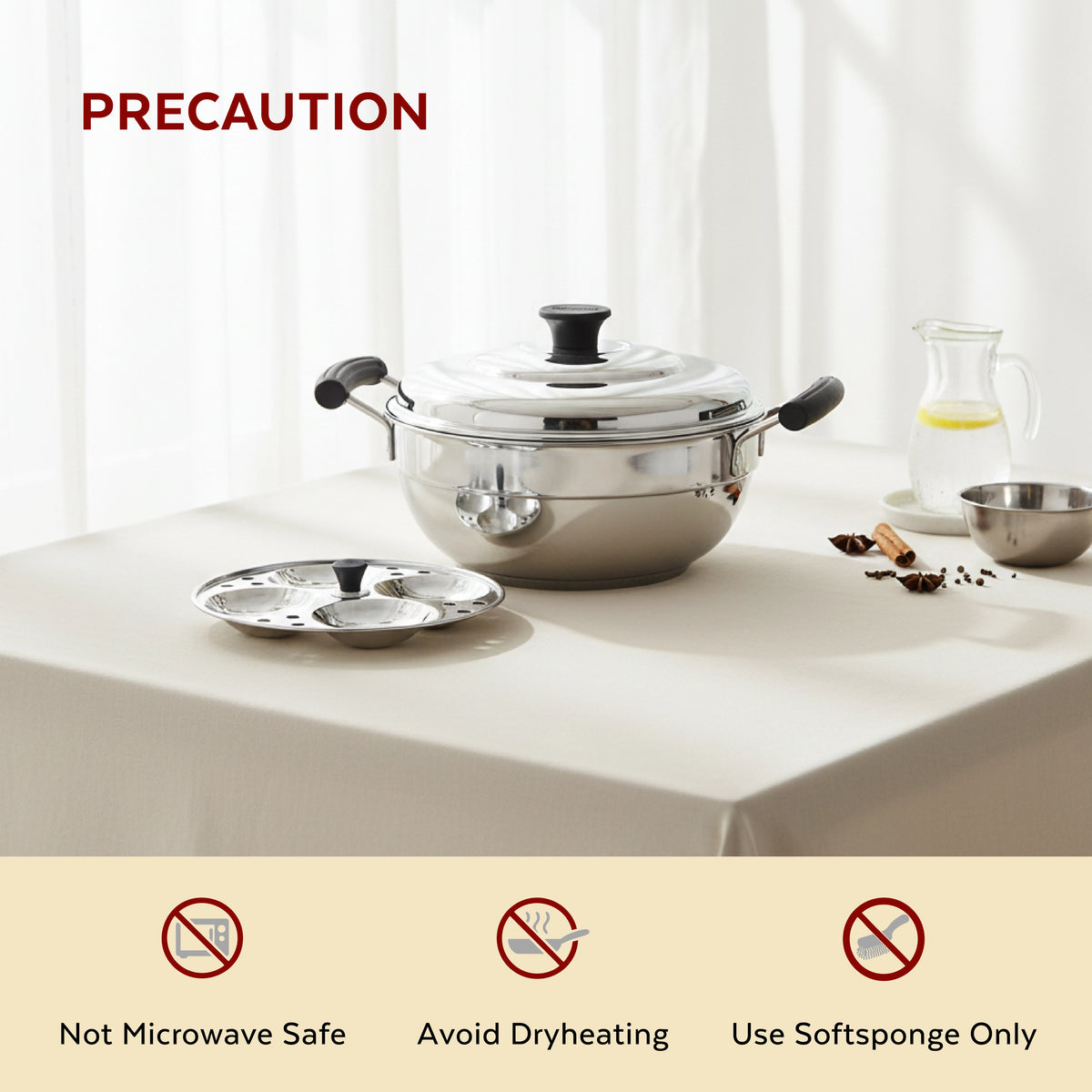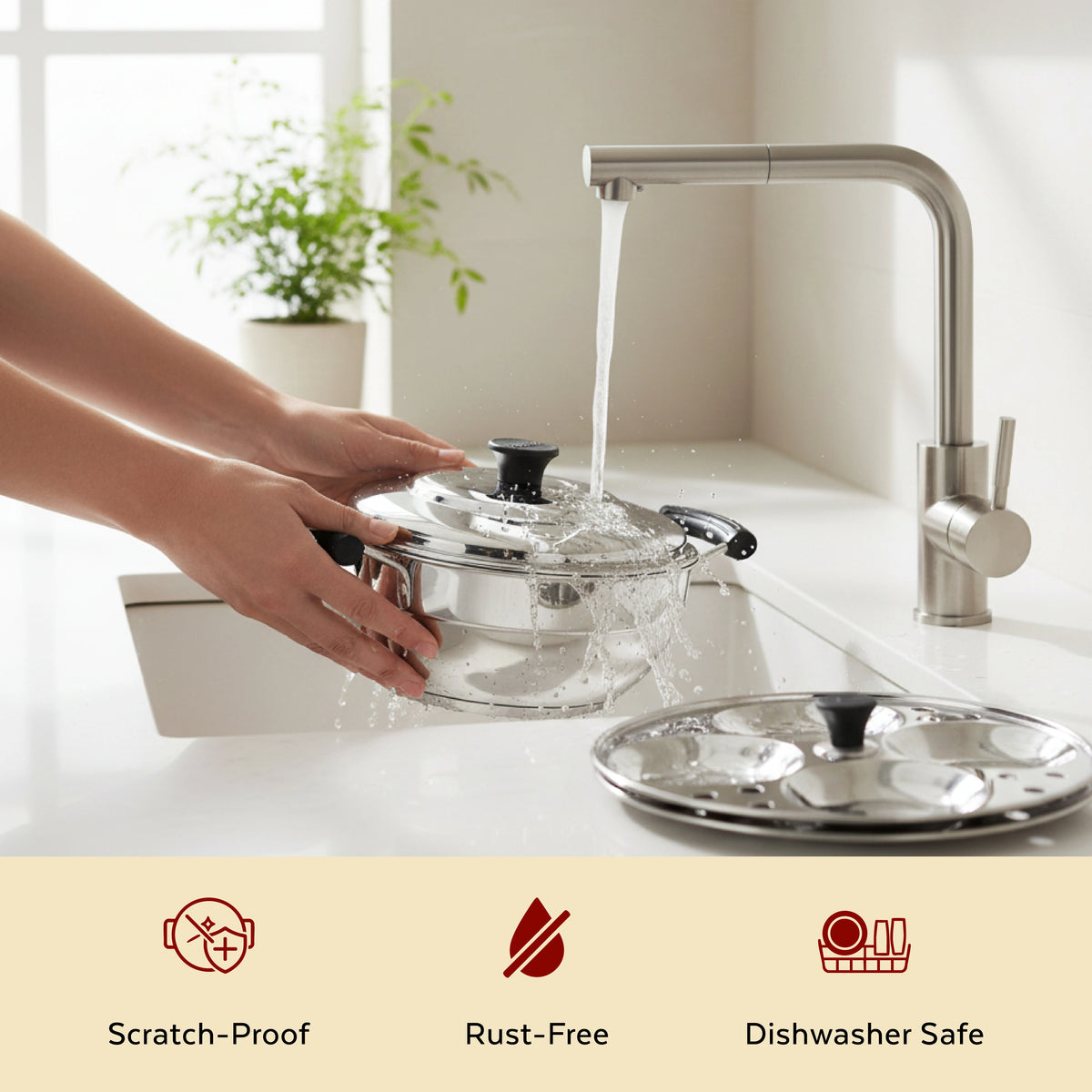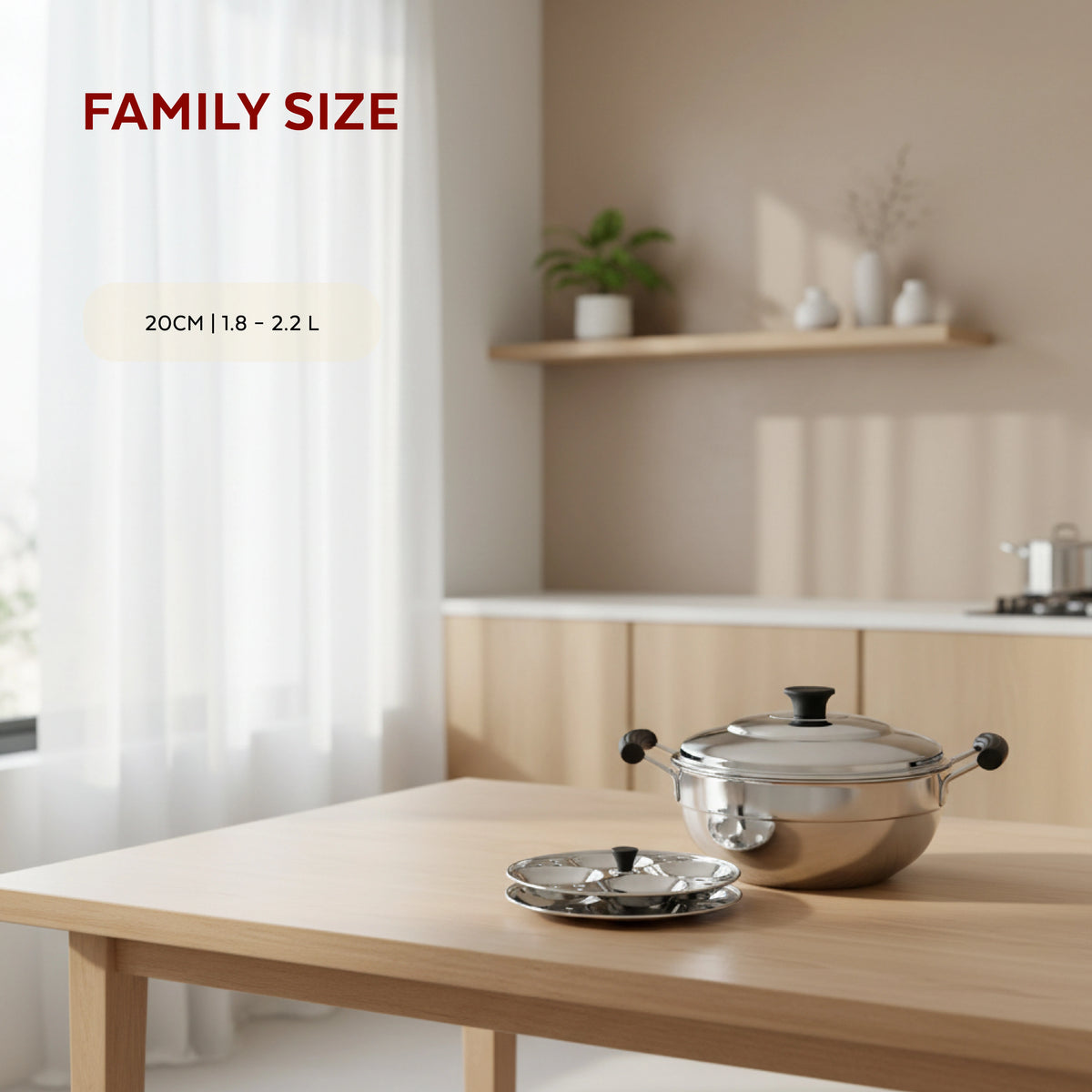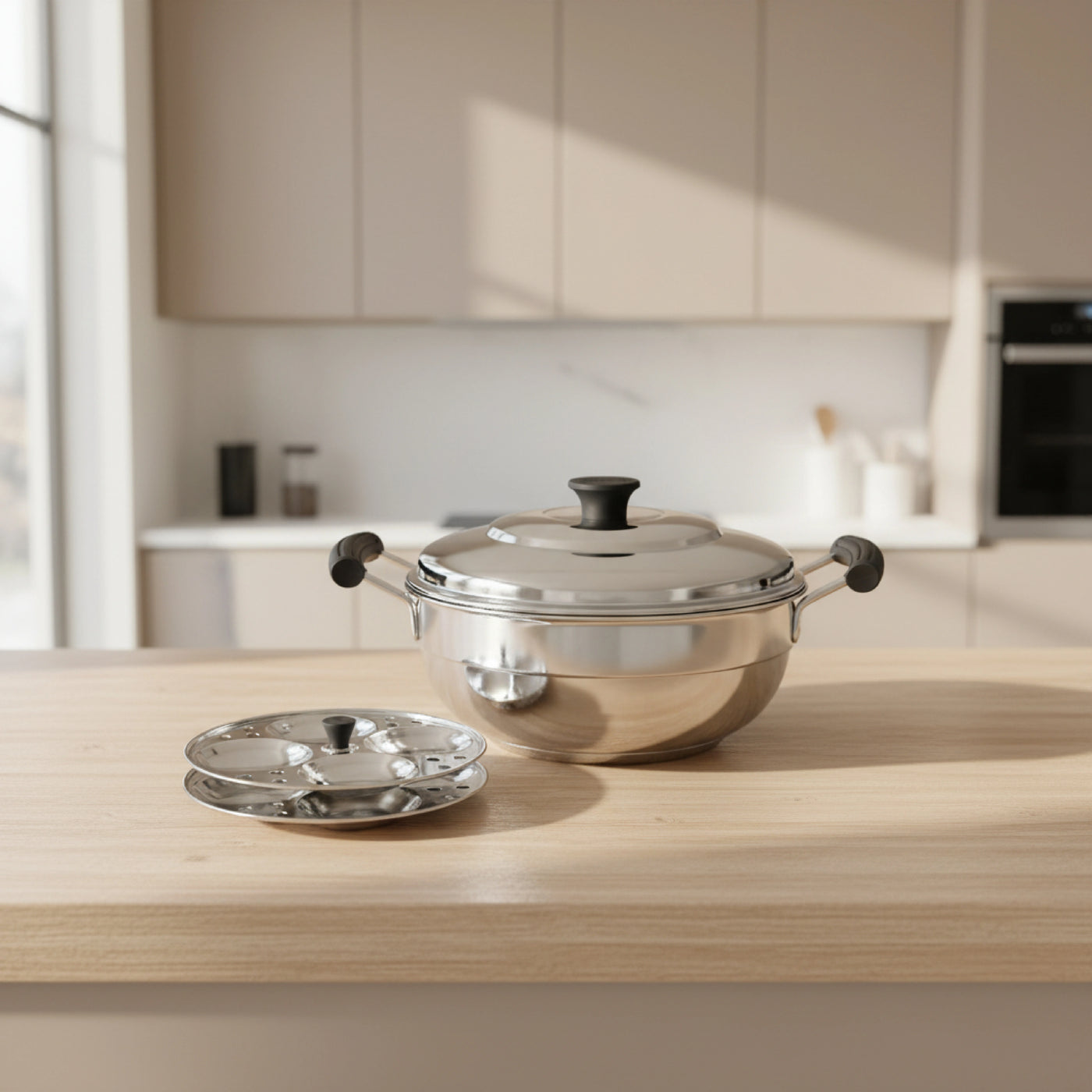 Crafted from high-quality stainless steel, it features a triply sandwich bottom for even heat distribution and faster cooking. The heat-resistant bakelite handle, steam vent lid, and included idli plates make it a true all-in-one cooking companion.