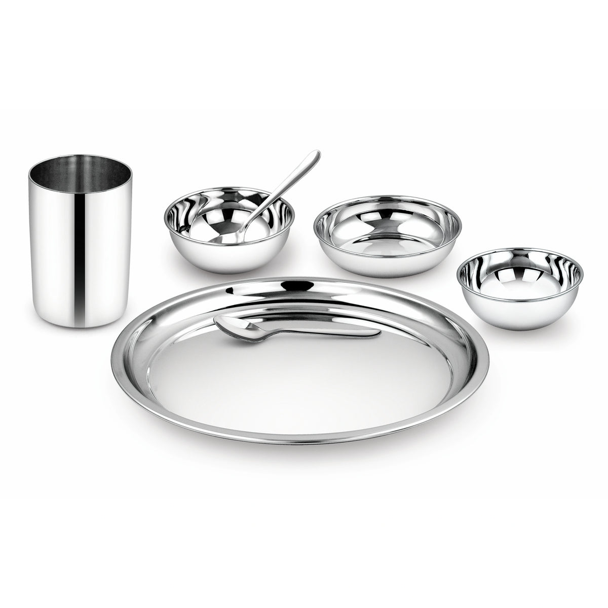 5-Piece Set – 1 small bowl, 1 medium bowl, 1 large plate, 1 steel tumbler, 1 spoon