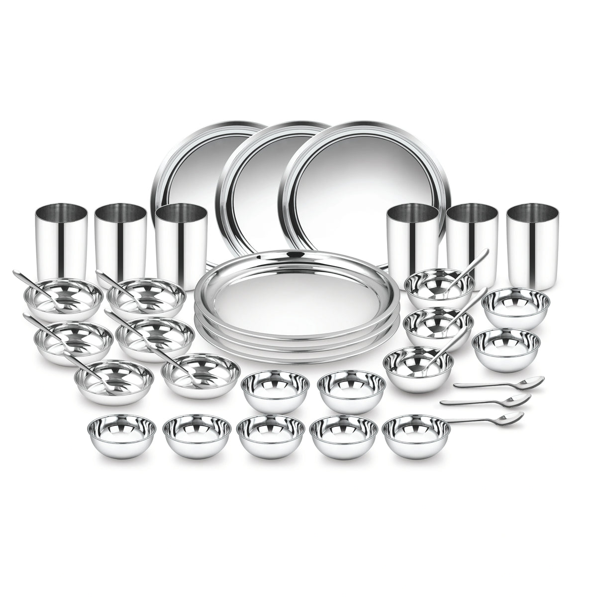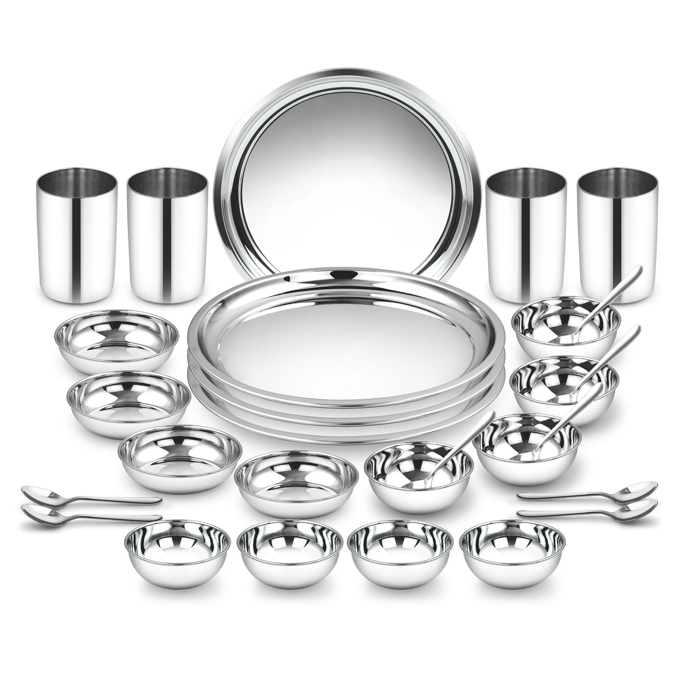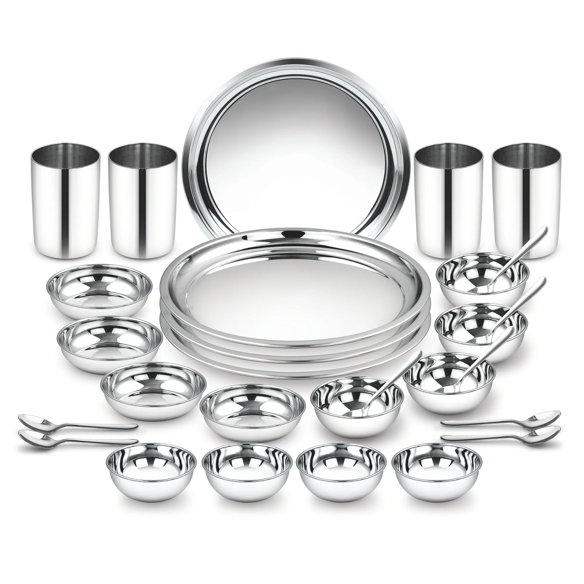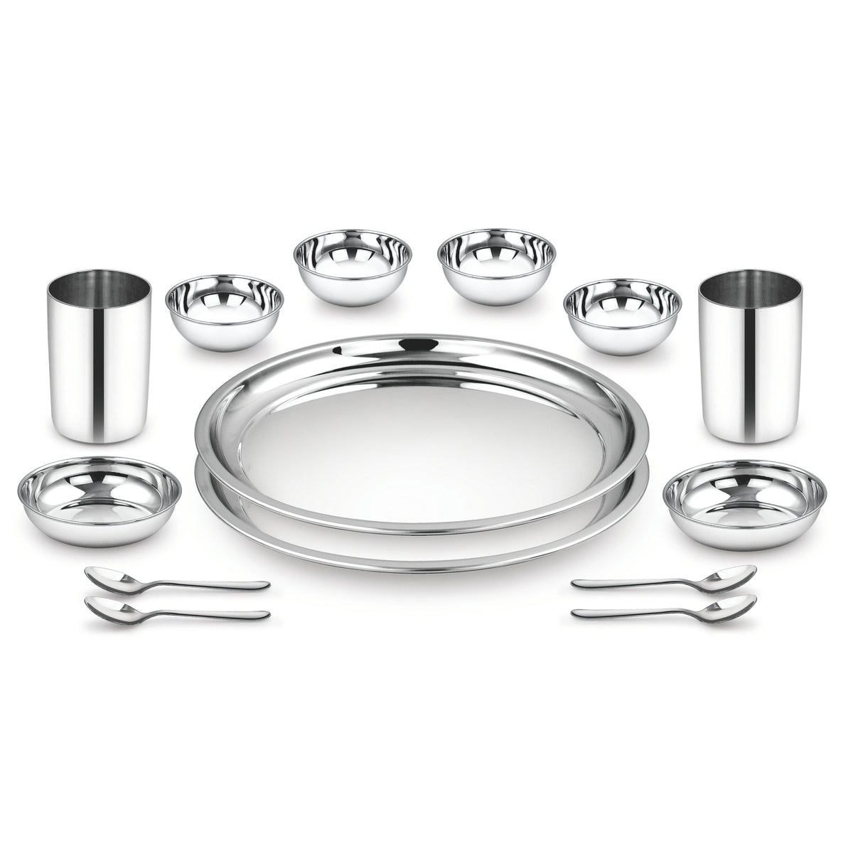 Food is a visual delight before it ever touches your palate — and the MAHAA Ragga Dinner Set makes that first impression unforgettable. With its classic round contours, mirror finish, and smooth edges, this stainless steel dinner set complements your love for food with timeless elegance.