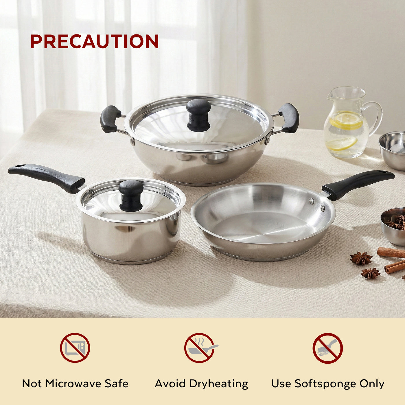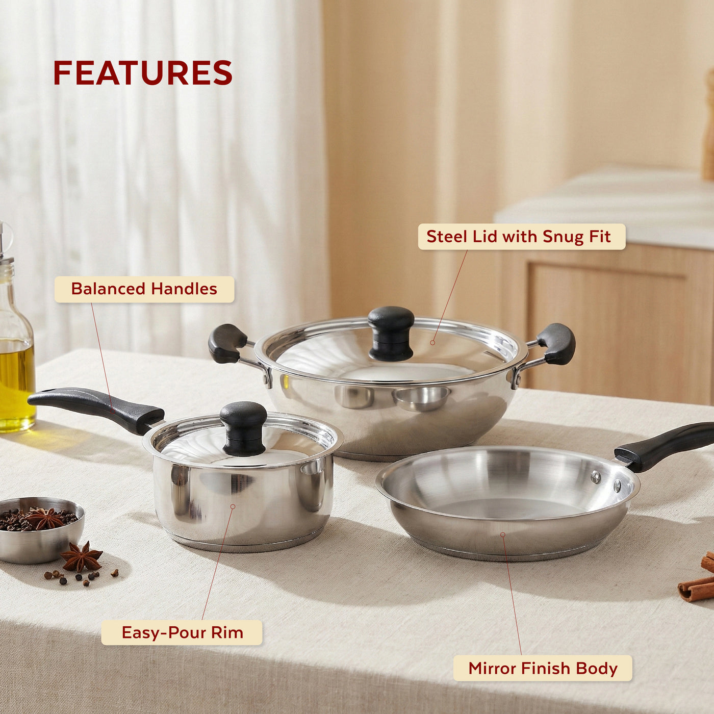Matching lids with cool-touch bakelite knobs fit the kadai and sauce pan, helping retain heat and moisture.