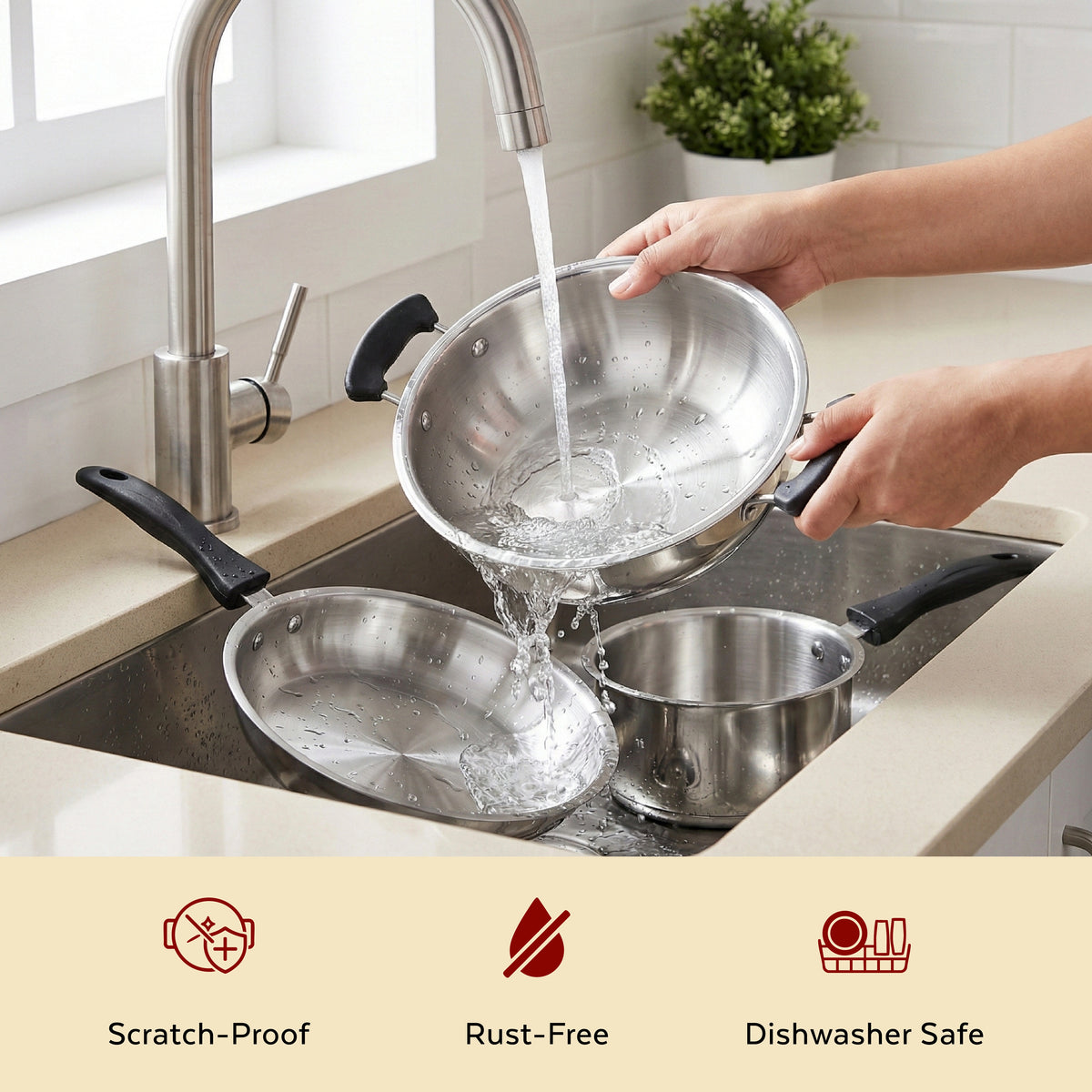 Each piece is crafted with a 3-layer sandwich base that distributes heat evenly, ensuring energy-efficient cooking on both gas and induction cooktops.