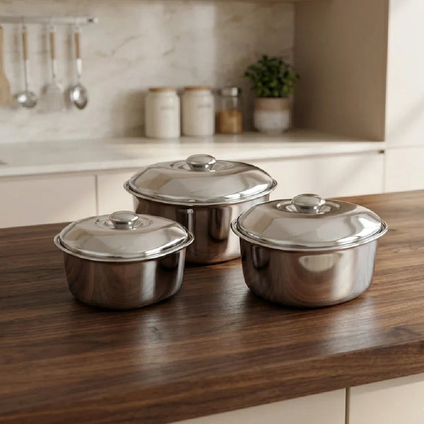 Round Octagon Dining Dish Set: 3pc Stainless Steel Serving Bowls, Mirror Finish, Snug-Fit Lids, Rust-Free & Durable, Serve Gravy, Sabzi, Dal, Biryani, Rice, Sweets